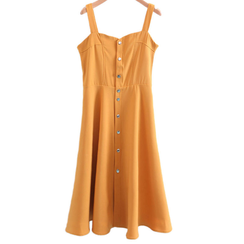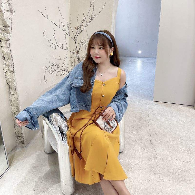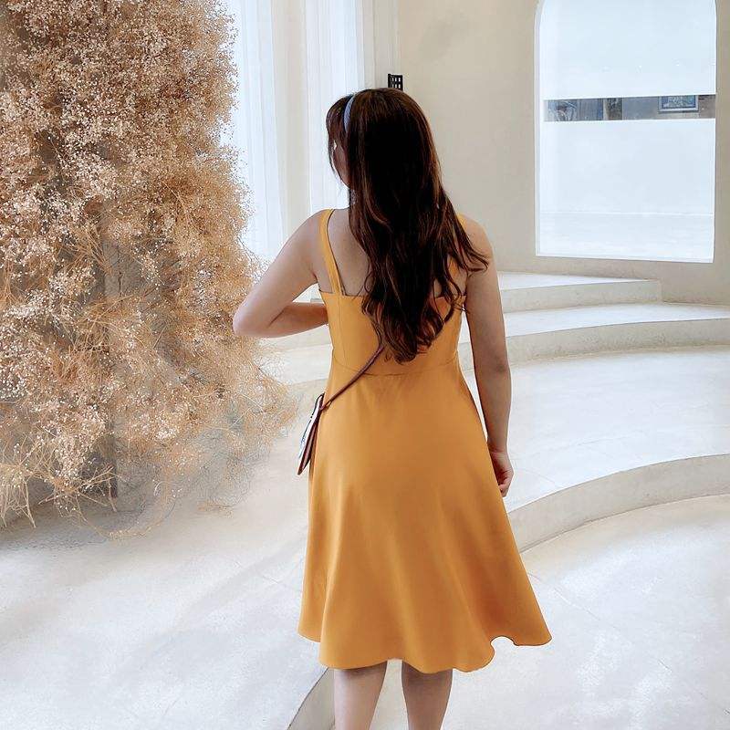 เดรสแขนกุดเปิดไหล่สำหรับผู้หญิงไซส์ใหญ่ สีเหลืองขมิ้น N7984 ชุดลำลองสำหรับวันหยุด