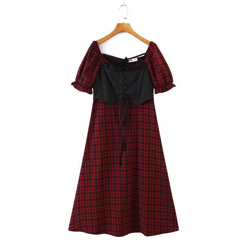 ชุดเดรสลายสก็อตสีแดงของผู้หญิงไซส์พิเศษคอเหลี่ยมผ้าชีฟองสไตล์วินเทจ N8406N8406-1