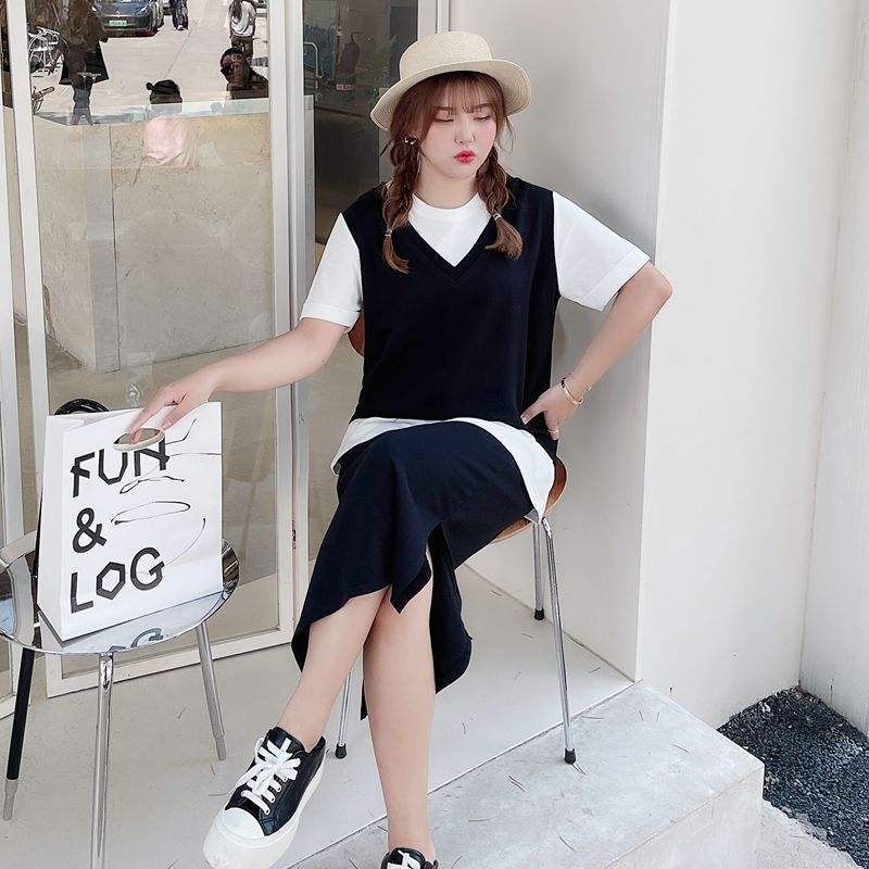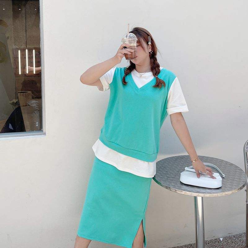 ชุดเซ็ตเสื้อยืดแขนสั้นและกระโปรงทรงสปอร์ต สำหรับสาวพลัสไซส์ ดีไซน์คัลเลอร์บล็อก ผ้าถักเนื้อนุ่ม สไตล์ลำลอง รุ่น N8060