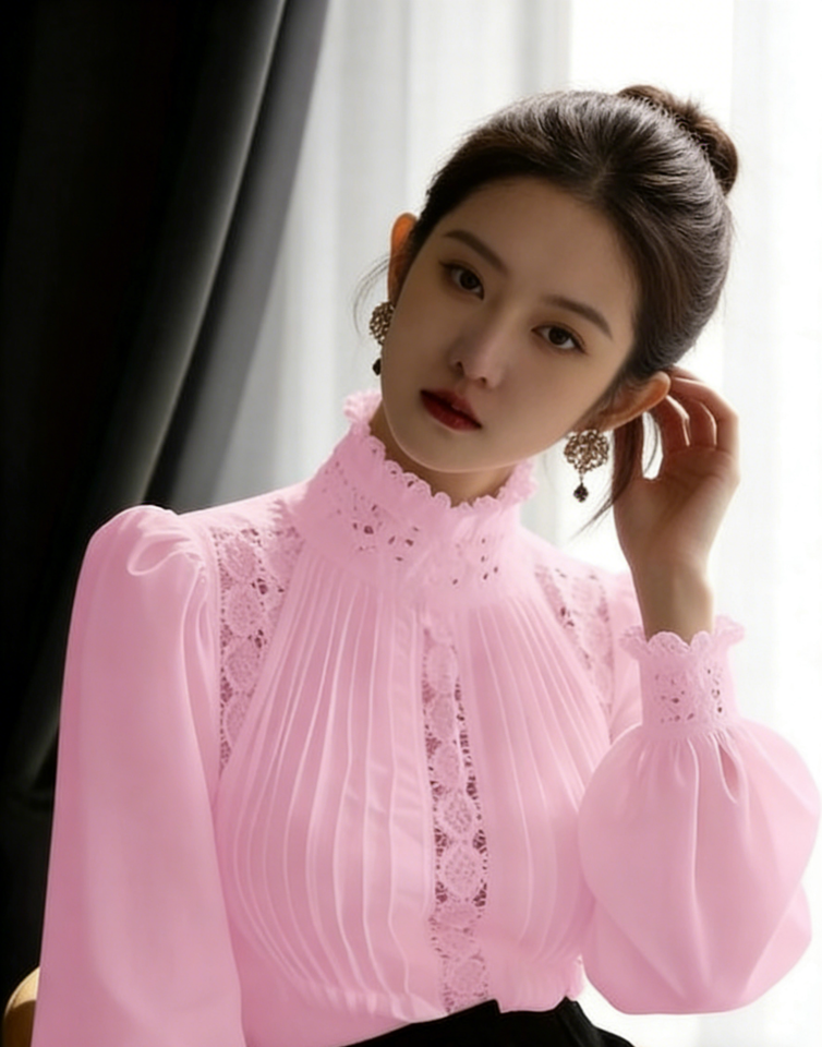 เสื้อผู้หญิงไซส์ใหญ่ สีชมพูล้วน แต่งลูกไม้ คอทรงโอ ดีไซน์หรูหรา ผ้าชีฟองจับจีบ แขนทรงโคมไฟ เหมาะสำหรับใส่ในฤดูใบไม้ผลิ/ฤดูใบไม้ร่วง สวมใส่ได้ทั้งแบบเป็นทางการและลำลอง