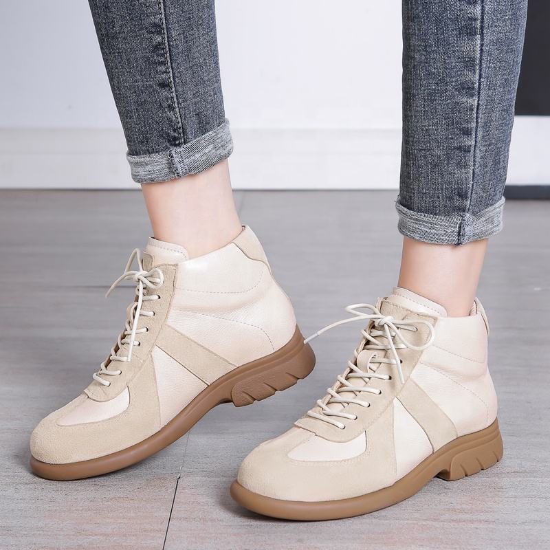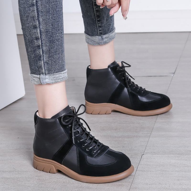 รองเท้าบูทลำลองส้นหนาหนังวัวแท้แบบผูกเชือกทรงสูงสำหรับผู้หญิงไซส์ใหญ่ ระบายอากาศได้ดี แฟชั่นฤดูใบไม้ผลิและฤดูใบไม้ร่วง