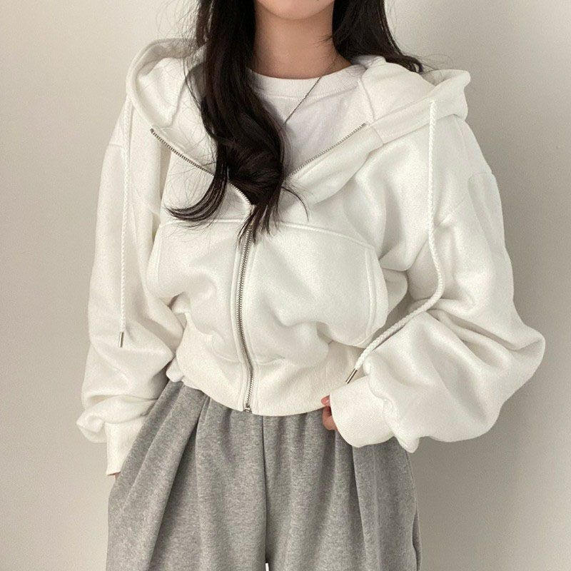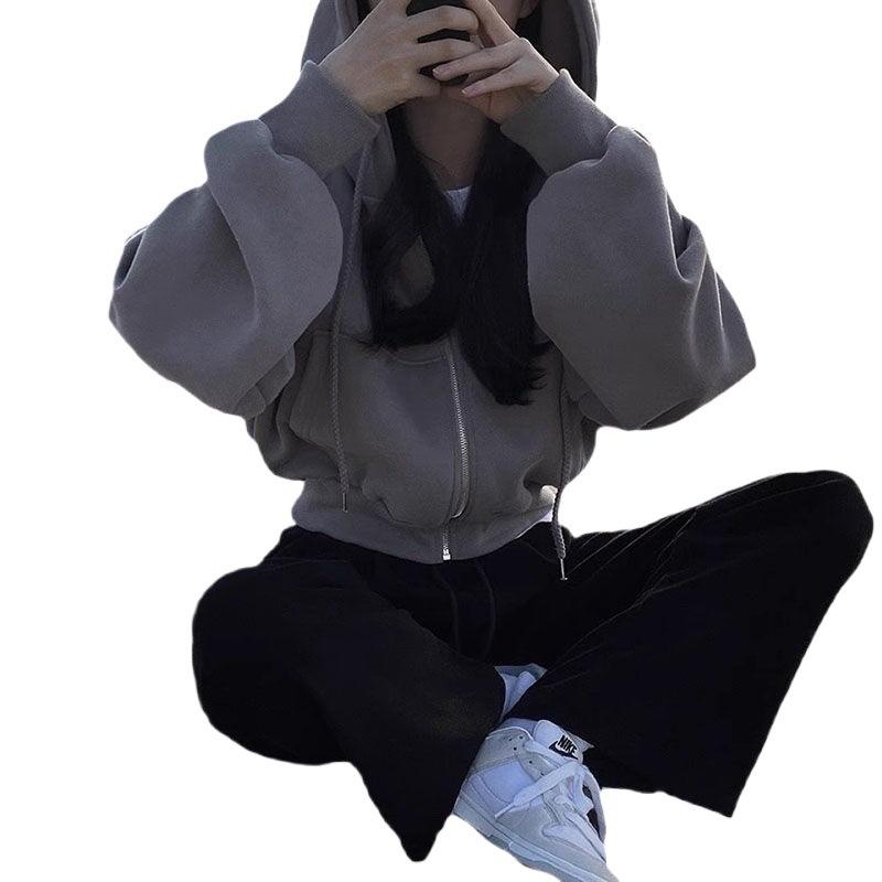 ชุดเสื้อสเวตเตอร์ผู้หญิงไซส์ใหญ่ สีเทาอ่อน เสื้อมีฮู้ดมีซิป กางเกงสีดำ ผ้าฝ้ายถัก สไตล์เกาหลี ชุดลำลอง