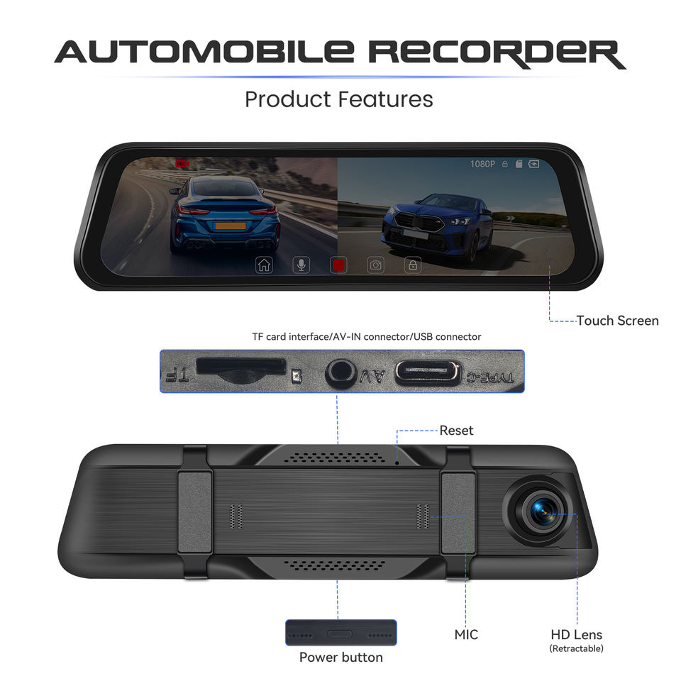 กล้องติดรถยนต์ Podofo 9.66 นิ้ว 1080P เลนส์คู่ หน้าจอสัมผัส IPS กระจกมองหลัง บันทึกแบบวนซ้ำ มองเห็นในเวลากลางคืน ขายส่ง