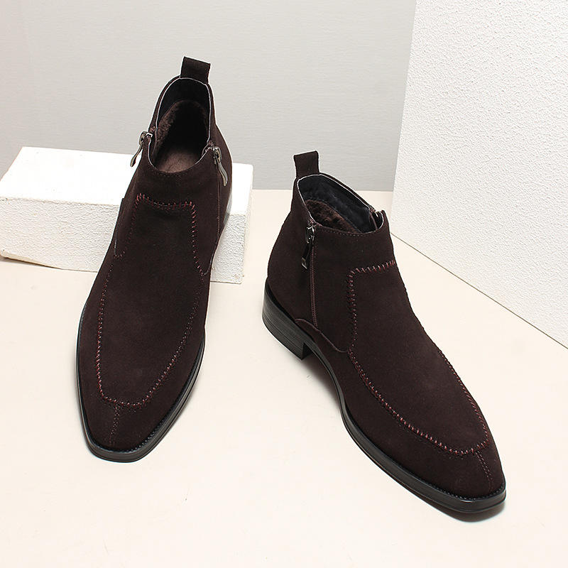 รองเท้าบูทเชลซีหนังแท้ทรงหัวแหลมสำหรับผู้ชาย รองเท้าทางการสำหรับธุรกิจ งานแต่งงาน เจ้าบ่าว พื้นหนา เพิ่มความสูง รองเท้าหุ้มข้อ