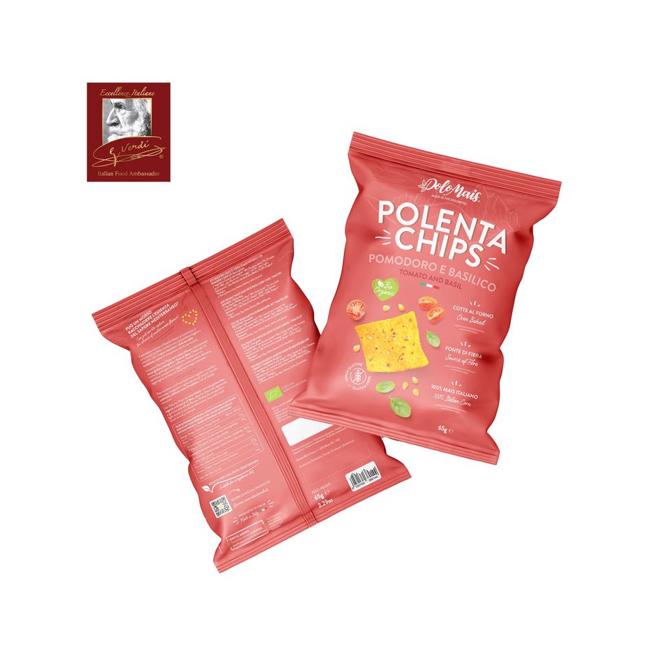 โพเลนต้าชิปส์ รสโทเมโทและโหระพา 65 กรัม ขนมขบเคี้ยวจากข้าวโพด GVERDI อาหารอิตาเลียน ผลิตในอิตาลี อาหารเรียกน้ำย่อย ขนมขบเคี้ยวรสเค็ม