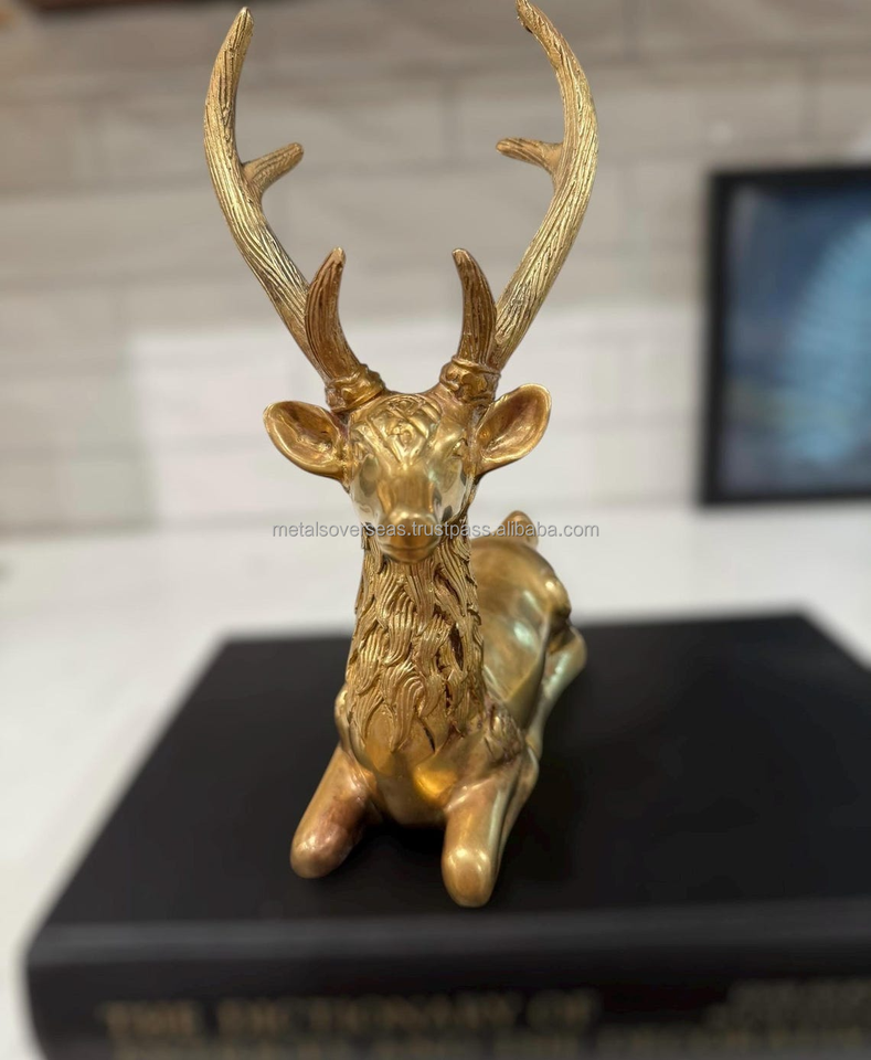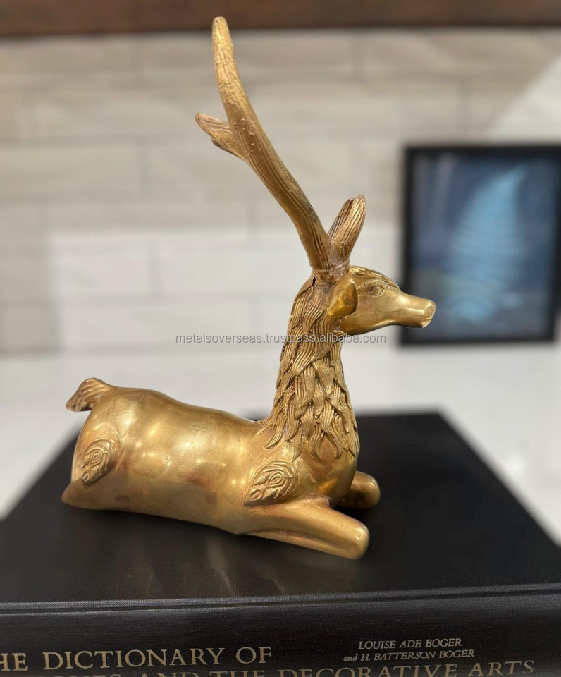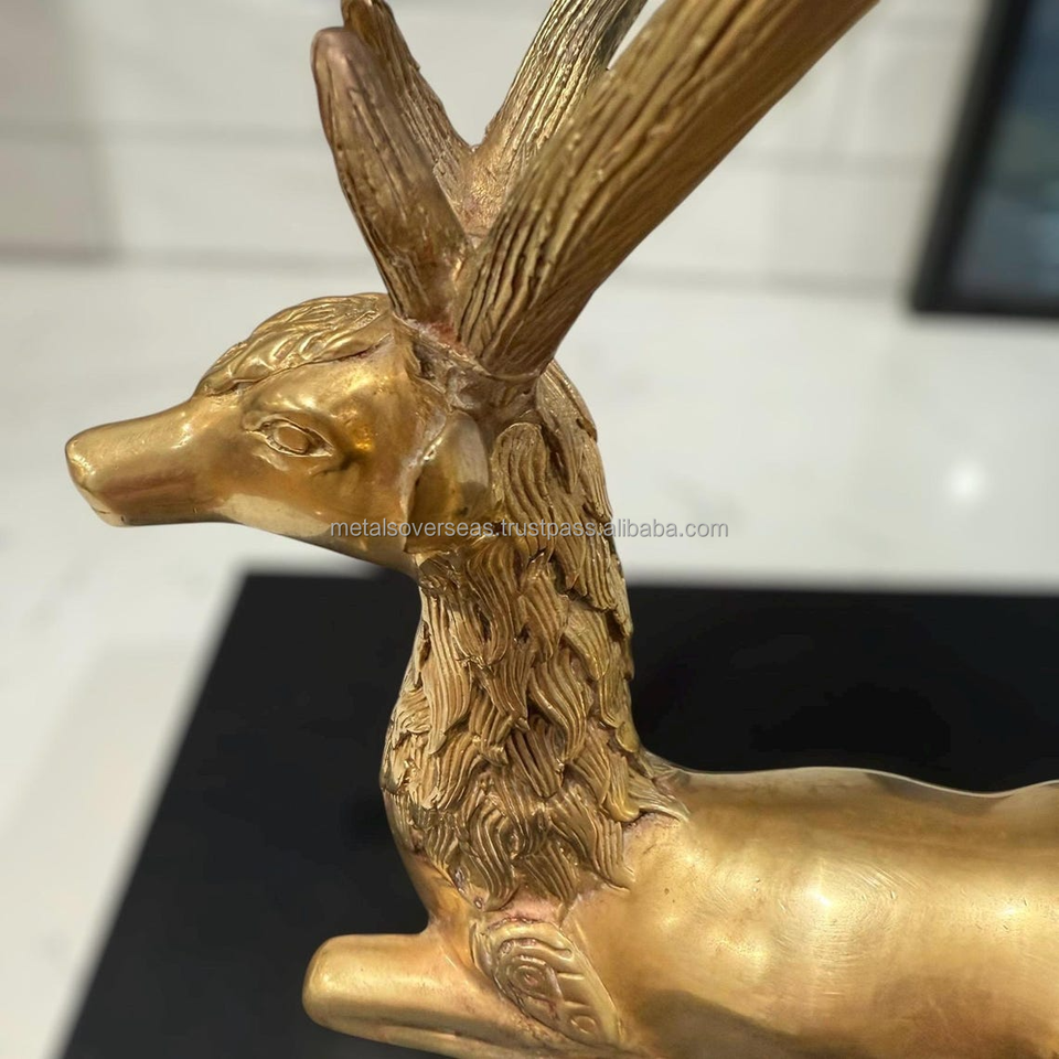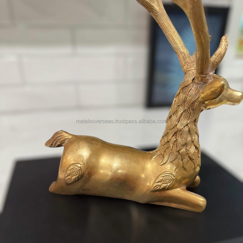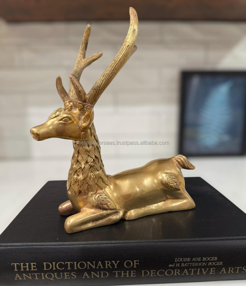 รูปปั้นกวางโบราณทำจากทองเหลืองขัดเงา พร้อมเขากวางขนาดใหญ่ สำหรับตกแต่งบ้าน