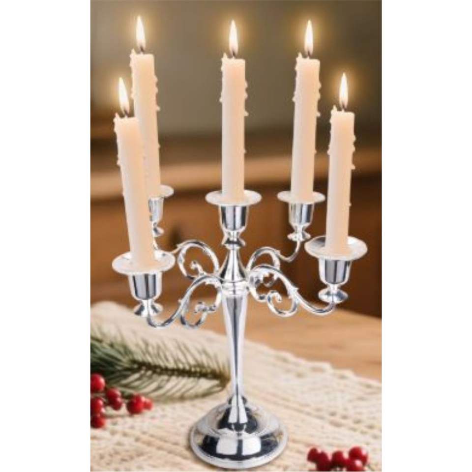 เชิงเทียนโลหะโครเมียมขัดเงา | เชิงเทียนสไตล์วินเทจ 5 แขน พร้อมหยดน้ำห้อยประดับ | ของตกแต่งกลางโต๊ะอาหาร