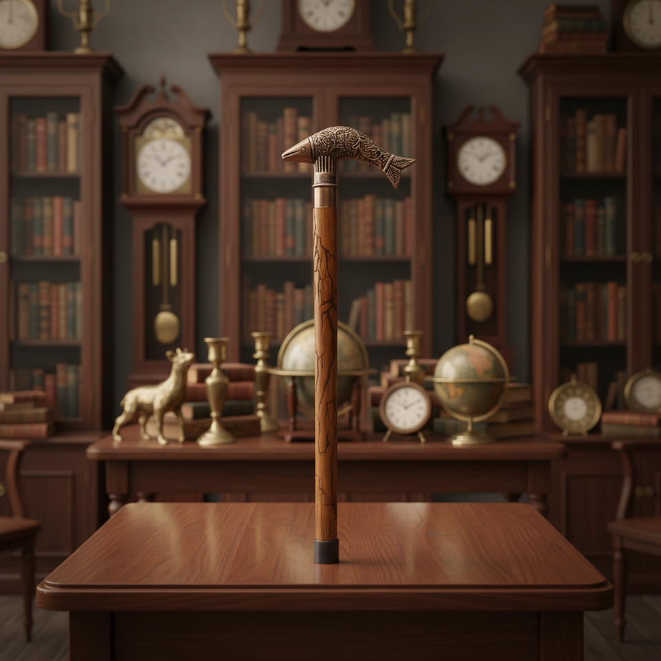 ไม้เท้าโบราณแบบโมเดิร์นหัวปลาแกะสลักโลหะขัดเงา