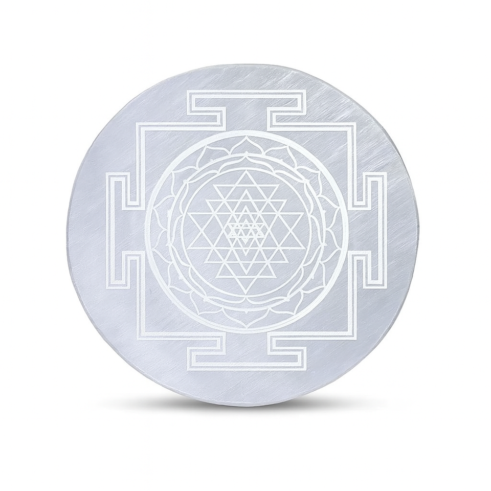 แผ่นชาร์จพลังงานจักระทรงกลมทำจากเซเลไนต์ พร้อมสลักลายศรียันตรา คริสตัลสีขาวธรรมชาติ สำหรับการทำสมาธิและตกแต่ง