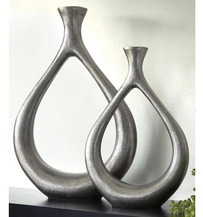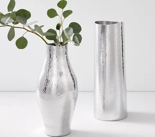 แจกันโลหะสีเงินขัดเงาพร้อมหม้ออลูมิเนียมตกแต่งด้วยมือที่ทันสมัยและเงางามสำหรับการตกแต่งบ้านและโต๊ะที่หรูหรา