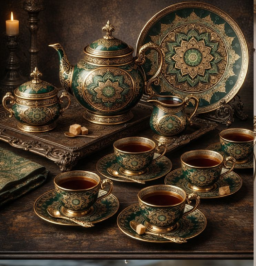 ชุดน้ำชาทองเหลืองขัดเงาพร้อมลวดลายดอกไม้เคลือบสีสันสดใส วางบนถาดขนาดใหญ่แบบตอกลาย มีจำหน่ายในราคาขายส่ง
