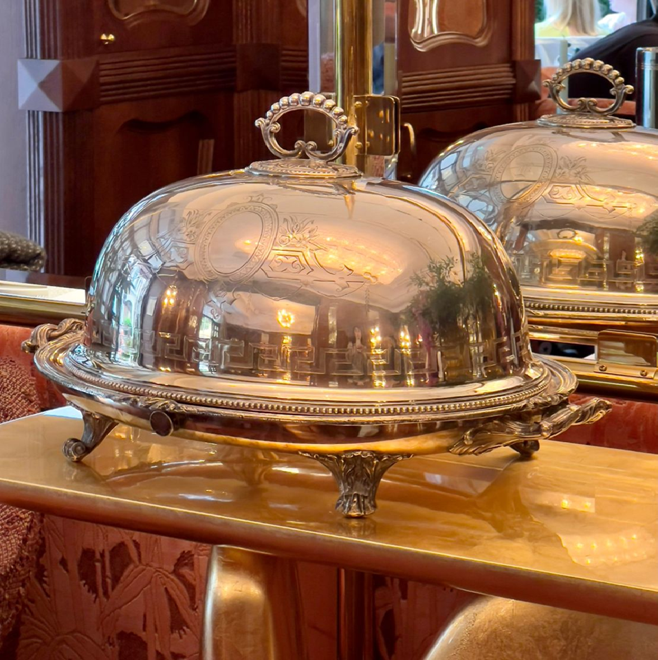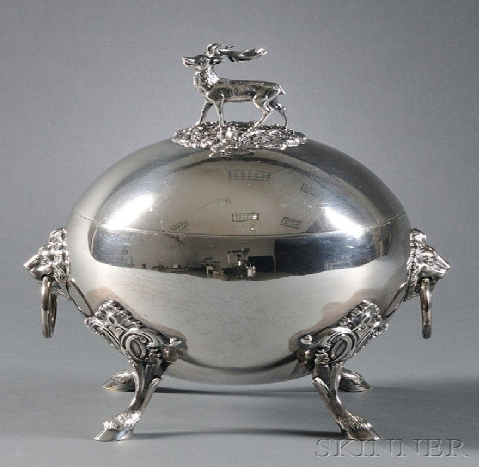 ชามทรงกลมสีเงินขัดเงา ประดับด้วยหัวแกะสลักรูปกวางอันสง่างามและหูจับรูปหน้ากากสิงโต มีจำหน่ายในราคาขายส่ง
