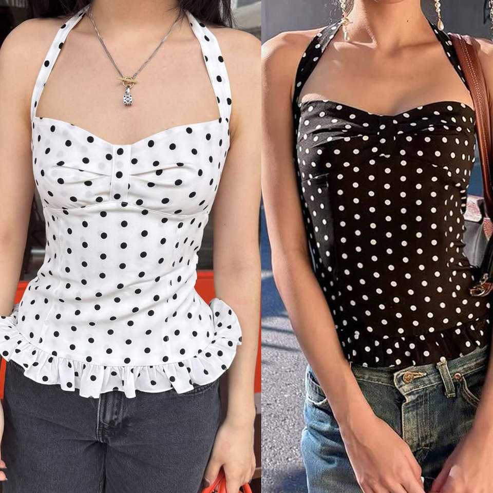 เสื้อกล้ามคอเชือกผูกแบบมีลายจุดสีสันสดใส แต่งขอบลูกไม้หวานๆ ผลิตจากผ้าทอที่เป็นมิตรต่อสิ่งแวดล้อม ระบายอากาศได้ดี สไตล์มินิมอลที่สดใส