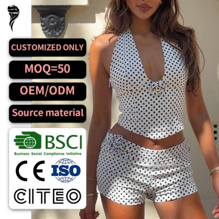 ชุดเซ็ตทูพีซลายจุดแบบผูกคอ เสื้อครอปคอวีสำหรับผู้หญิง กางเกงขาสั้นเอวสูง พร้อมดีเทลลายดอกไม้ 3 มิติ