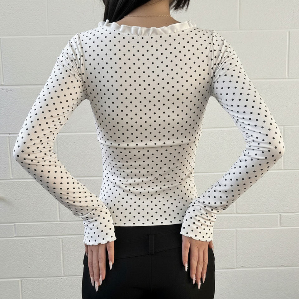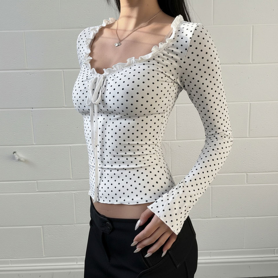 เสื้อยืดแขนยาวลายลูกไม้ลายจุด ทรงเข้ารูป แต่งรายละเอียดผูกโบว์ พร้อมขอบระบาย สำหรับสวมใส่ในชีวิตประจำวันแบบลำลอง