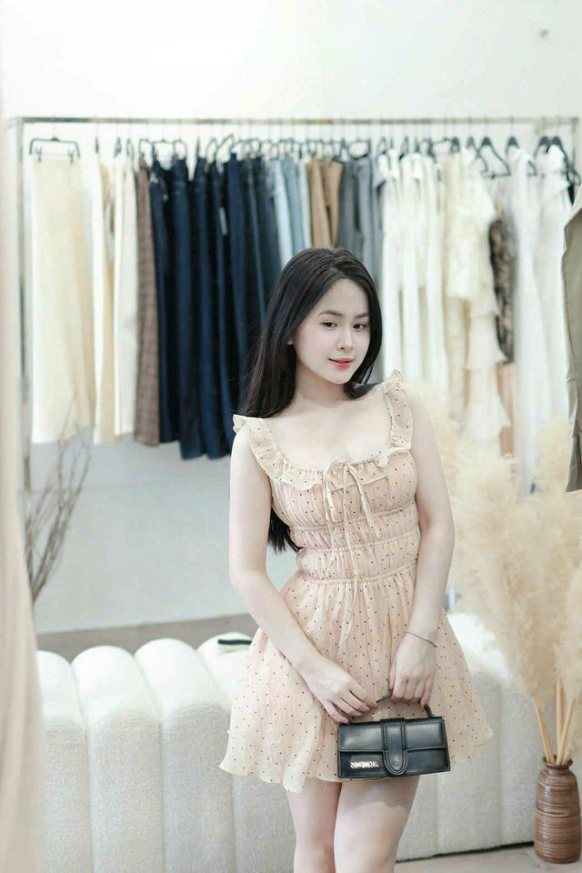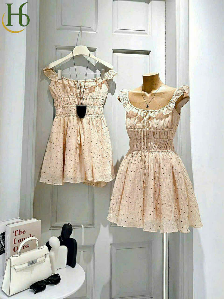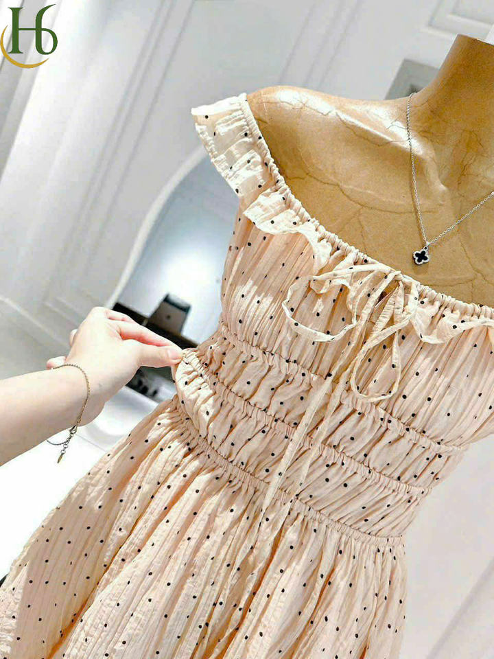 เดรสสั้นลายจุดเปิดไหล่แบบสม็อค เดรสยาวปานกลางเปิดไหล่สไตล์เวียดนาม แขนกุดลำลองหวานๆ วินเทจ โรงงานผลิตเสื้อผ้า OEM