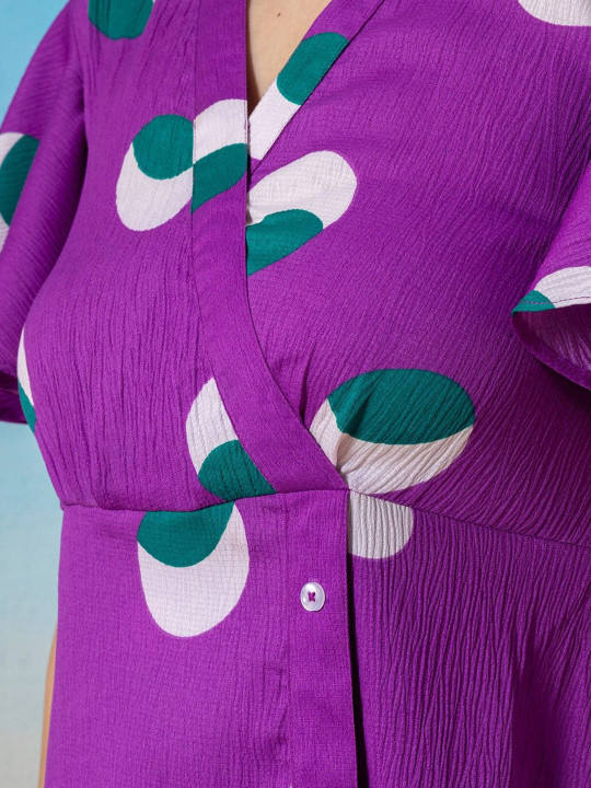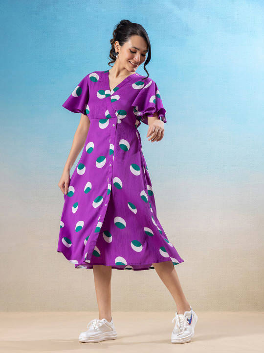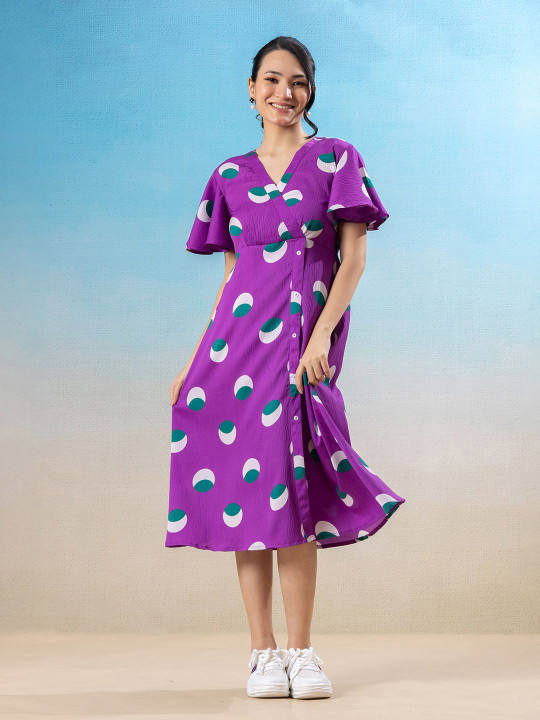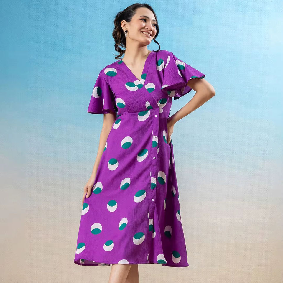 เดรสลายจุด แขนสามส่วน คอวี ยาวระดับเข่า เป็นมิตรกับสิ่งแวดล้อม เหมาะสำหรับฤดูร้อน เอวเข้ารูป สไตล์ทางการ