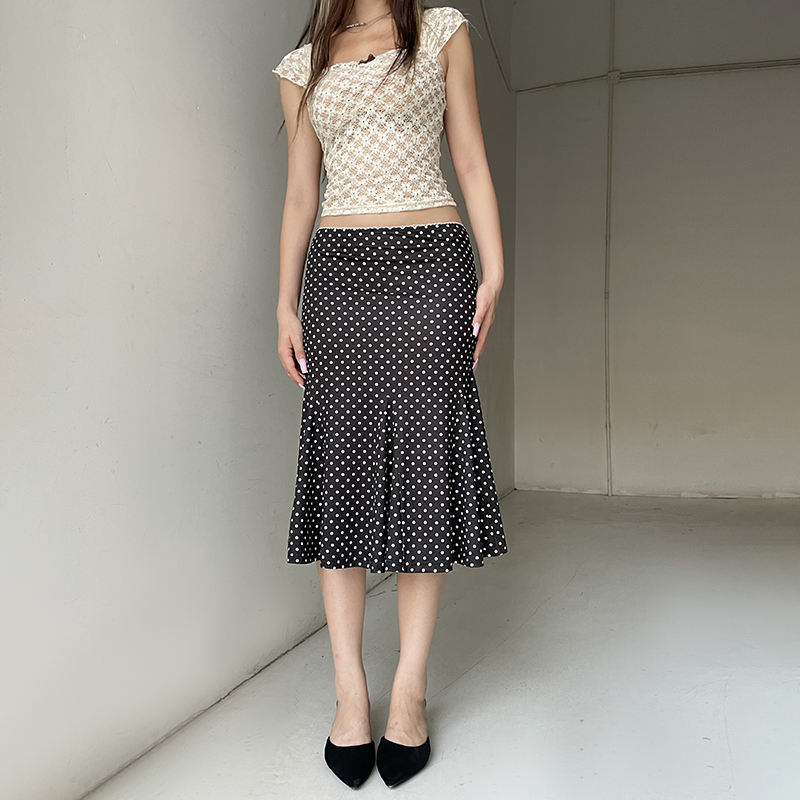 กระโปรงมิดิลายจุดระบายเอวสูงทรงเอไลน์น้ำหนักเบาสำหรับผู้หญิงลำลองฤดูร้อนชุดอเนกประสงค์หรูหรา