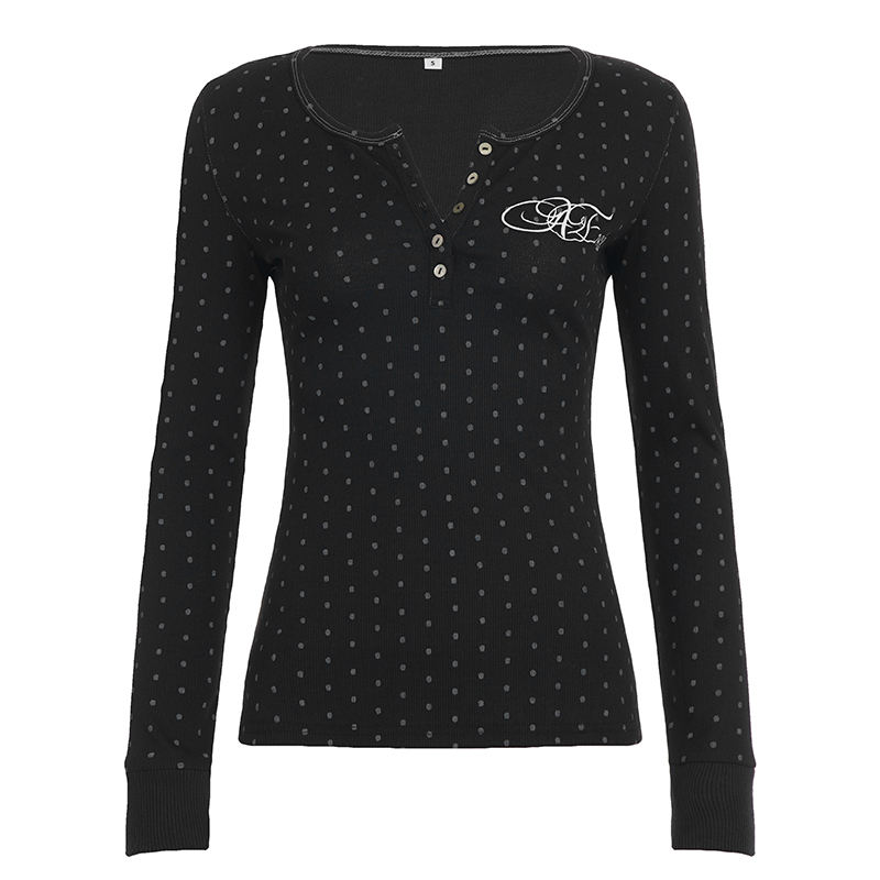 เสื้อยืดแขนยาวถักติดกระดุมคอวีลายจุดสำหรับผู้หญิงเสื้อผ้าแนวสตรีทแบบย้อนยุคแฟชั่น Y2K ลำลองเข้ารูปพอดีตัว