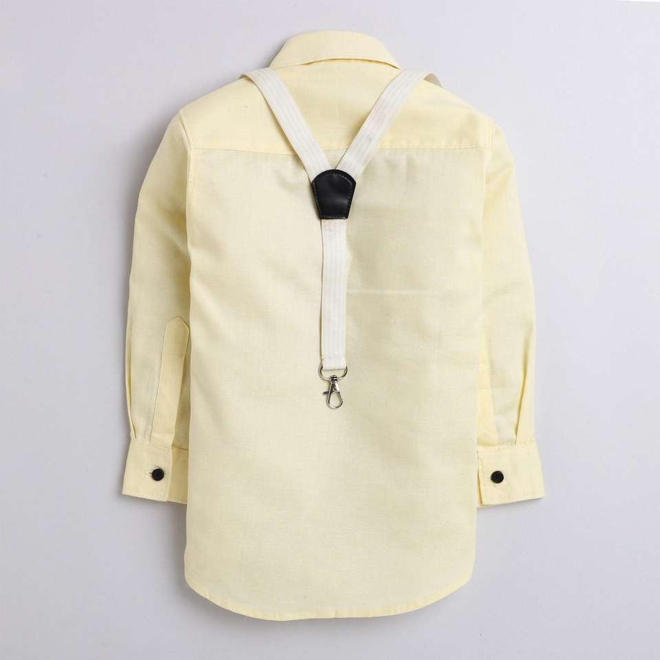 เสื้อปาร์ตี้ลายจุดสีเหลืองพร้อมโบว์ไม้ผูกและสายเอี๊ยมลายทาง