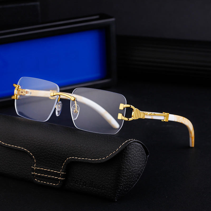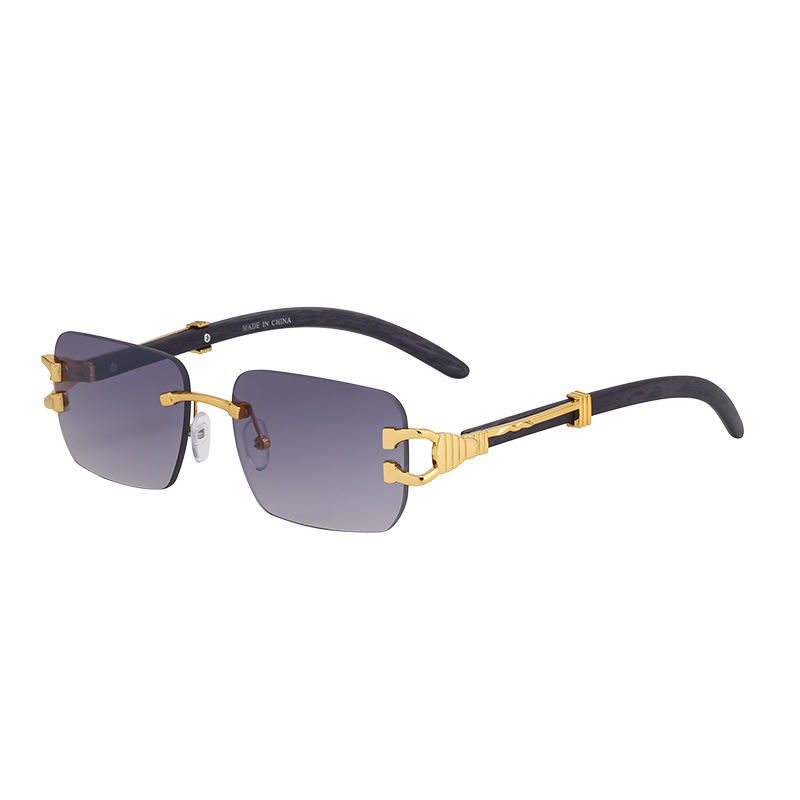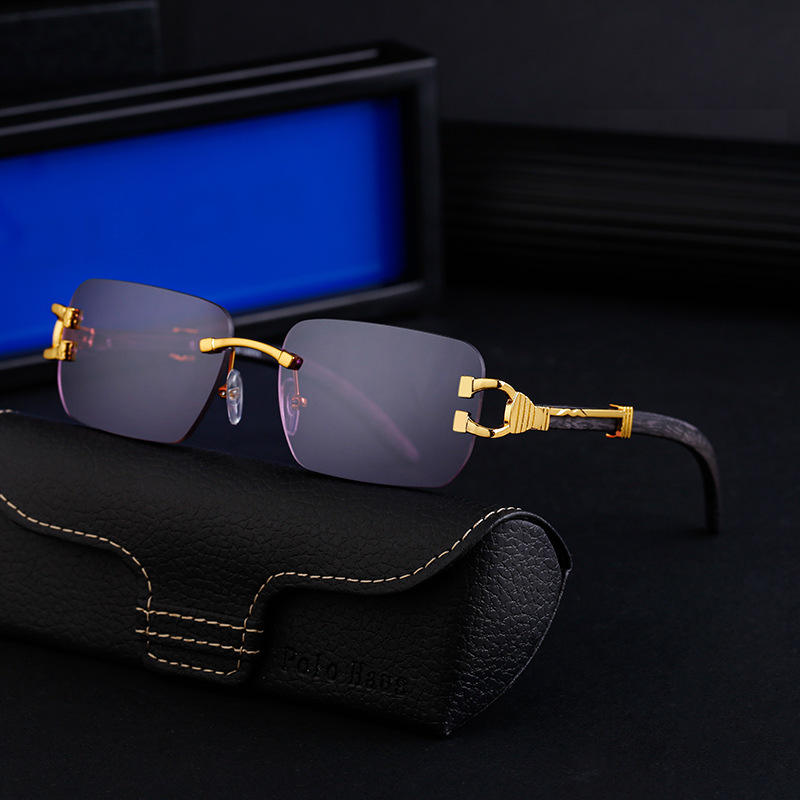 แว่นกันแดดไร้กรอบสำหรับผู้ชาย Polo Haus เลนส์ PC ป้องกันรังสียูวี 400 ขาแว่นลายไม้เทียมสีดำ สไตล์อินสตาแกรม