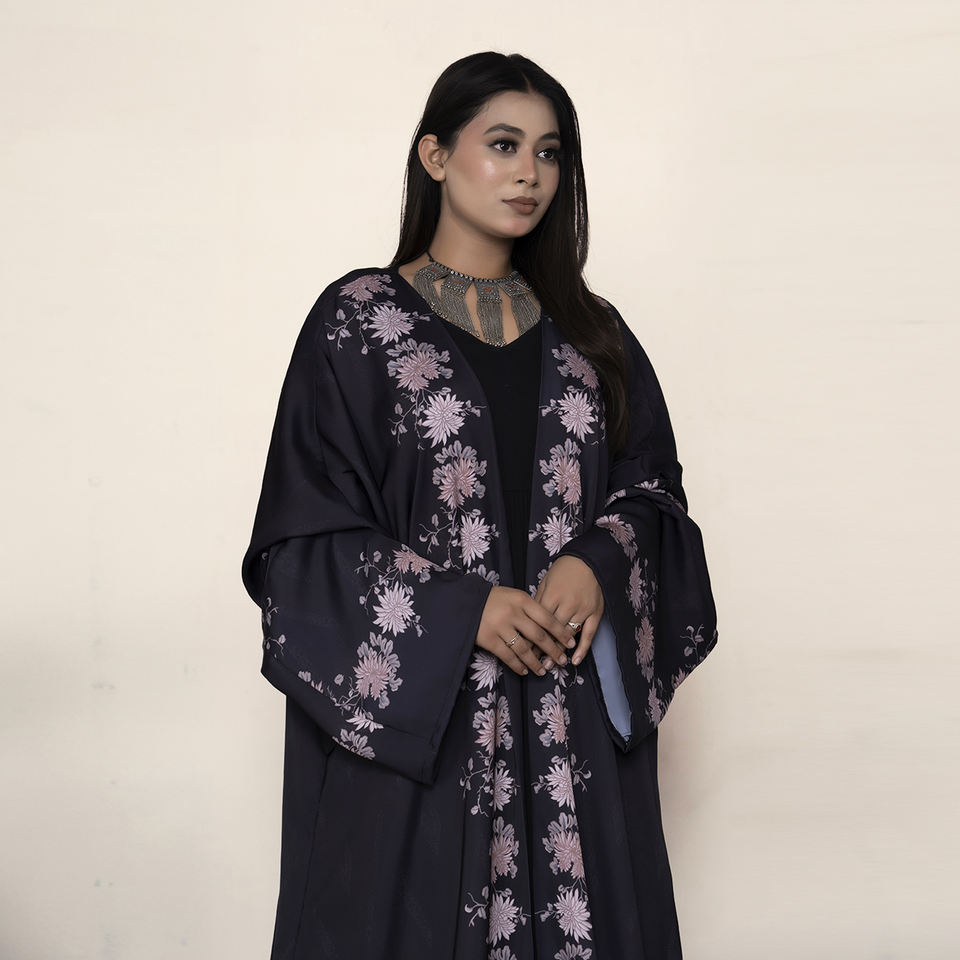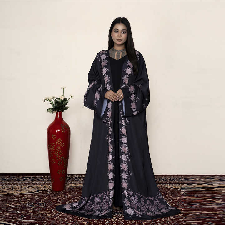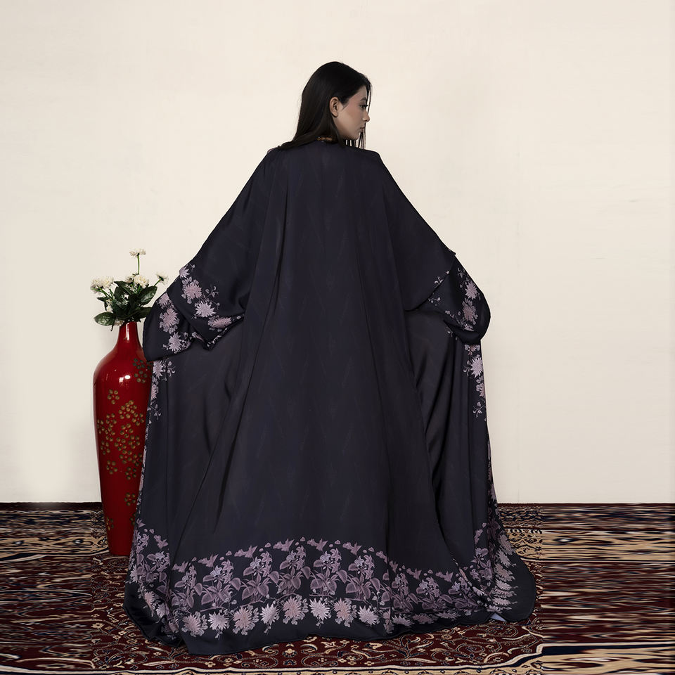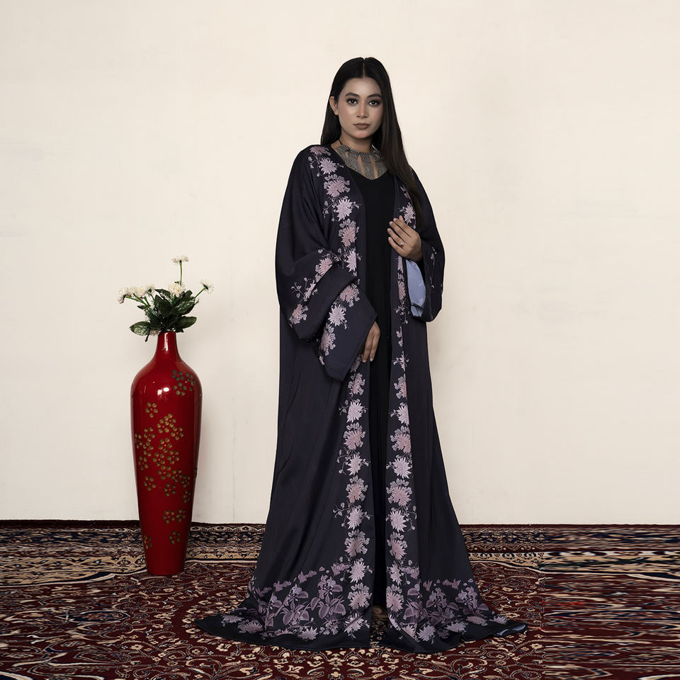 อาบายะผ้าโพลีซาตินนิดาเนื้อเนียนละเอียดลายดอกไม้ ดีไซน์เปิดด้านหน้า แขนกว้าง สง่างาม เหมาะสำหรับโอกาสพิเศษและงานทางการ