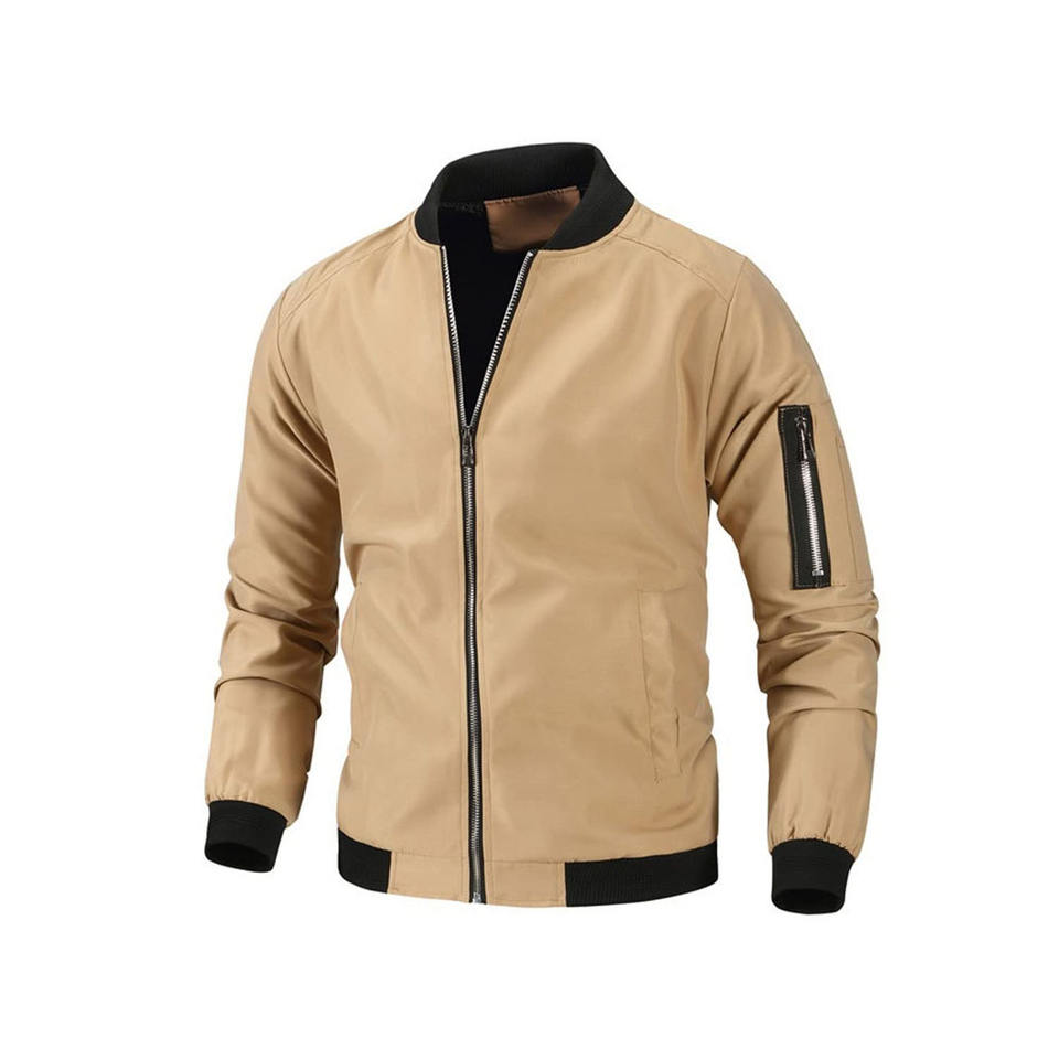 แจ็คเก็ตบอมเบอร์โพลีเอสเตอร์พร้อมปลายแขนเสื้อแบบริบและดีไซน์กระเป๋าแบบเฉียง ออกแบบมาสำหรับผู้ชาย เหมาะสำหรับงานเทศกาลและลุคสตรีทสุดเท่