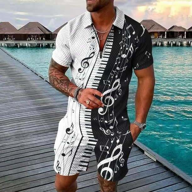 ชุดเสื้อยืดและกางเกงขาสั้นถักสไตล์วินเทจสำหรับผู้ชาย ผ้าโพลีเอสเตอร์/คอตตอน สำหรับฤดูร้อน พร้อมโลโก้ด้านหน้า