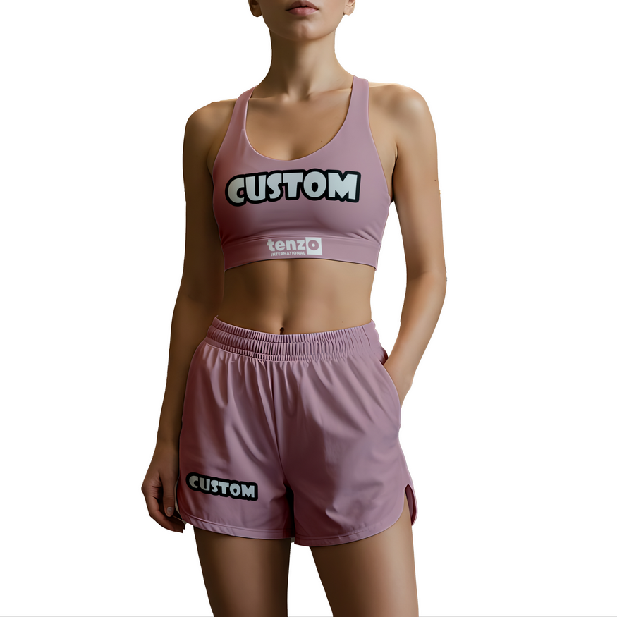 ชุดออกกำลังกายสำหรับผู้หญิงผ้าสแปนเด็กซ์โพลีเอสเตอร์ผลิตจากโรงงานเสื้อกล้ามกางเกงขาสั้นสำหรับออกกำลังกายพิมพ์ลายโลโก้และระบายอากาศได้อย่างรวดเร็ว