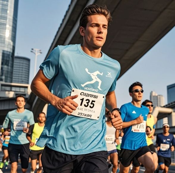 เสื้อยืดโพลีเอสเตอร์ระเหิดสำหรับการวิ่งมาราธอนเสื้อพิมพ์ลายกราฟิกแบบทั่วทุก100% เสื้อยืดโพลีเอสเตอร์สีฟ้า