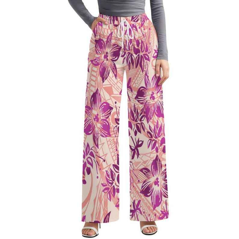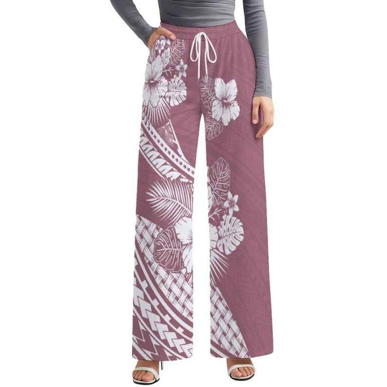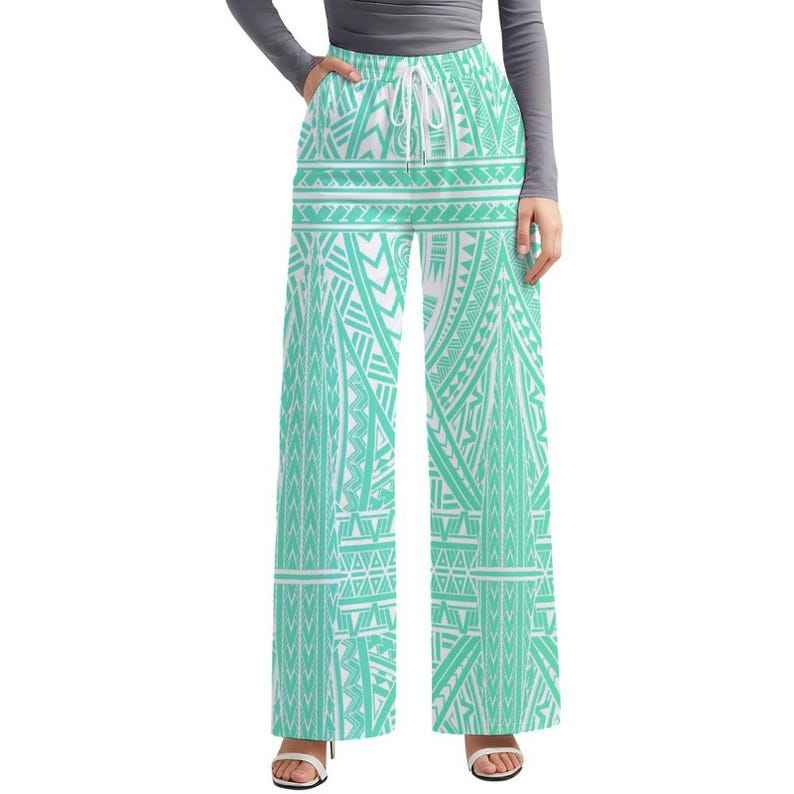 กางเกงชายหาดพิมพ์ลายชนเผ่าโพลินีเซียนฮาวายสำหรับผู้หญิง กางเกงขายาวทรงหลวมแฟชั่นสั่งทำพิเศษ