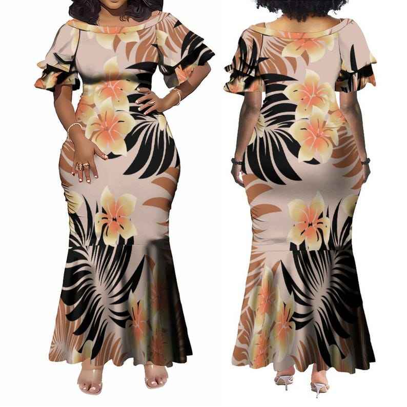 ชุดเดรสลายชนเผ่าโพลินีเซียนสไตล์ฮาวาย แขนระบายสองชั้นทรงเมอร์เมด ไซส์พลัสสำหรับผู้หญิง 1MOQ