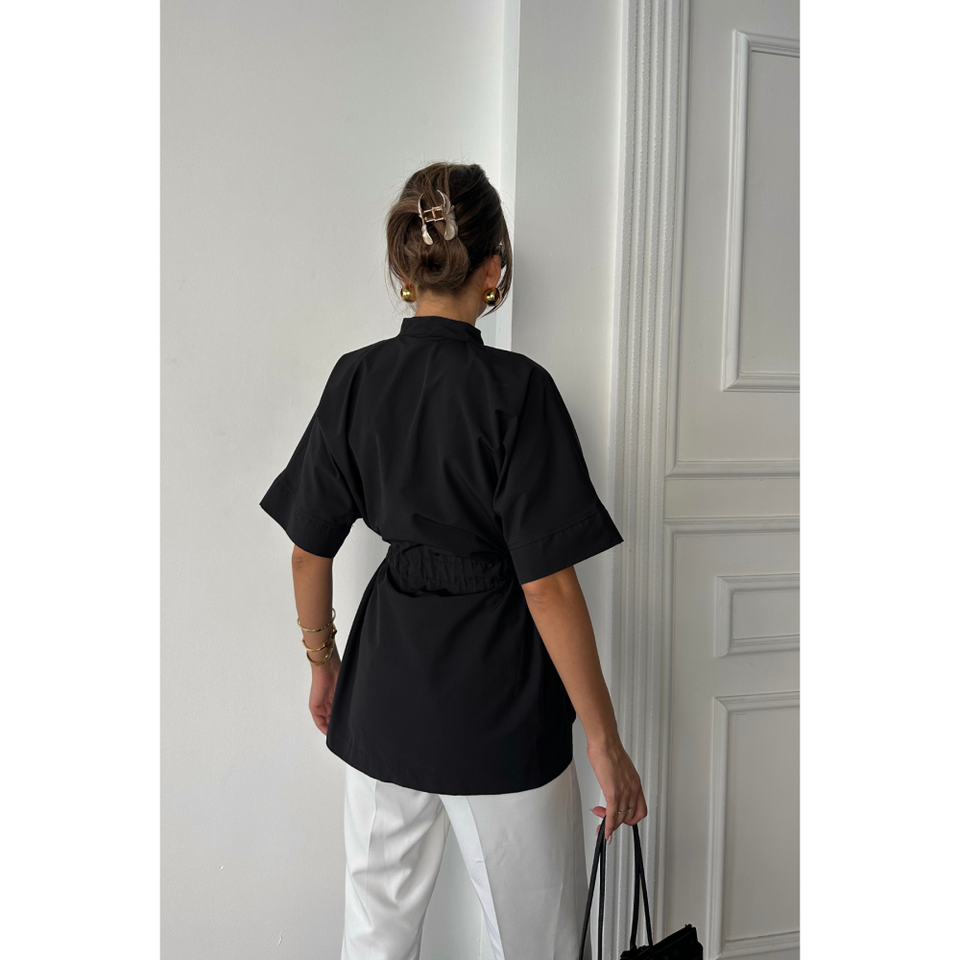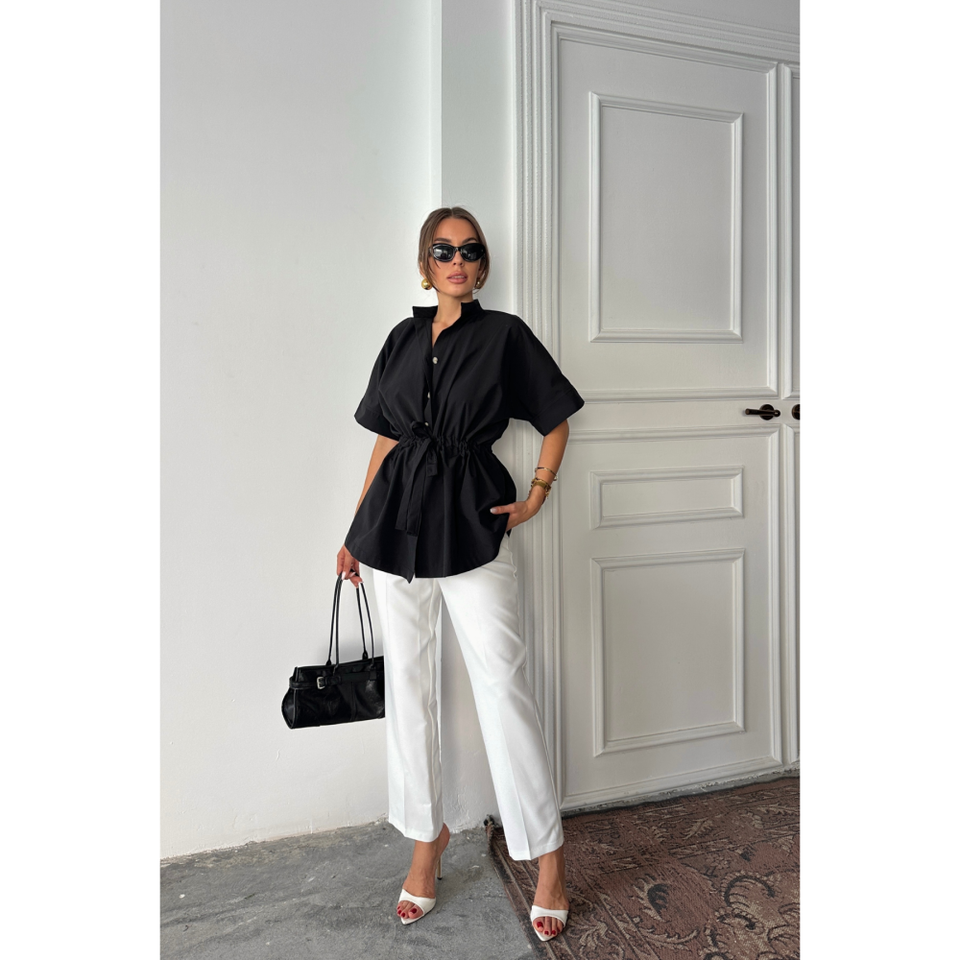 เสื้อเชิ้ตผ้าป๊อปลินสีดำ แต่งระบายช่วงเอว แขนสั้น ทรงเข้ารูป แฟชั่นทันสมัยสำหรับผู้หญิง