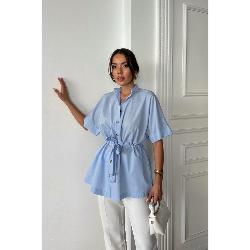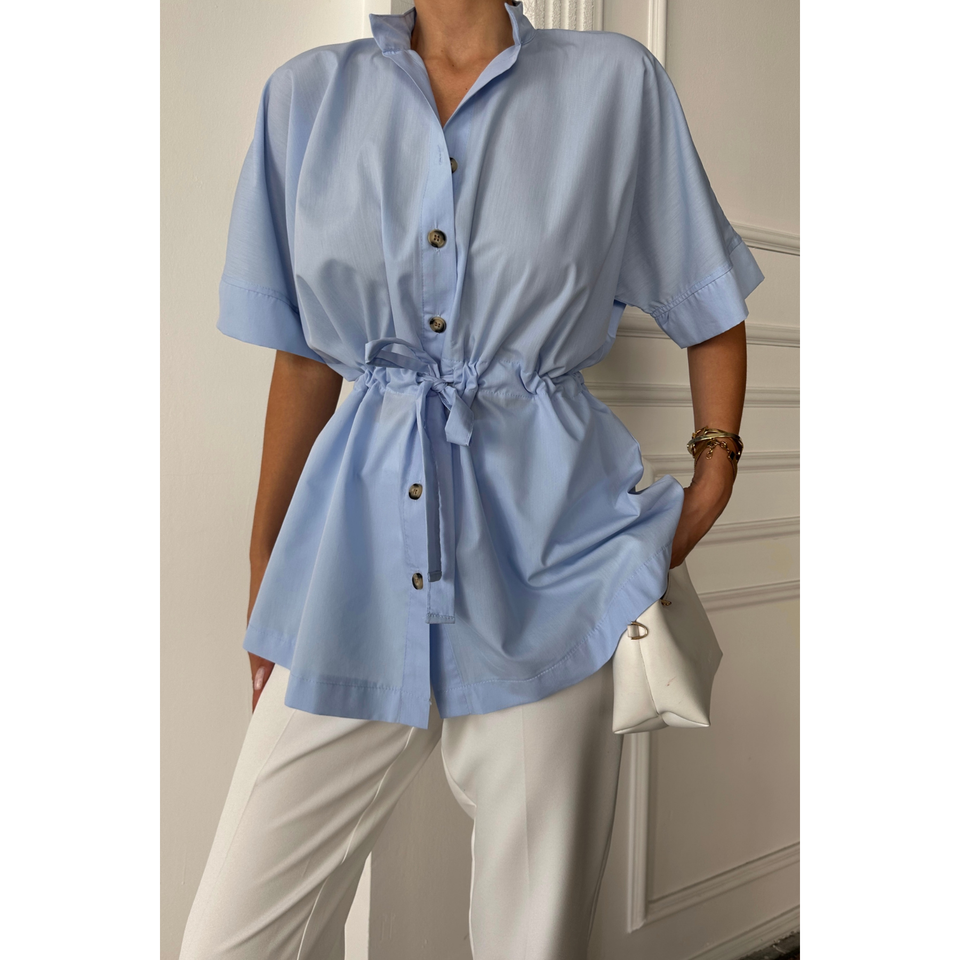 เสื้อเชิ้ตผ้าป๊อปลินสีน้ำเงินเข้ม แต่งระบายช่วงเอว แขนสั้น ติดกระดุมผ่าหน้า มีเข็มขัดรัดเอว ทรงพอดีตัว ไซส์ S