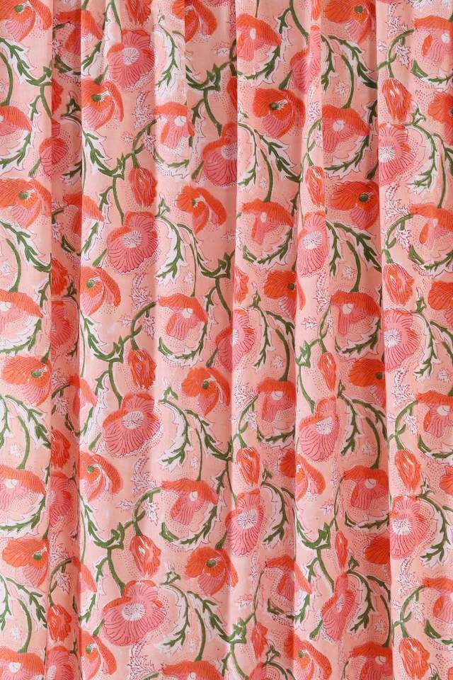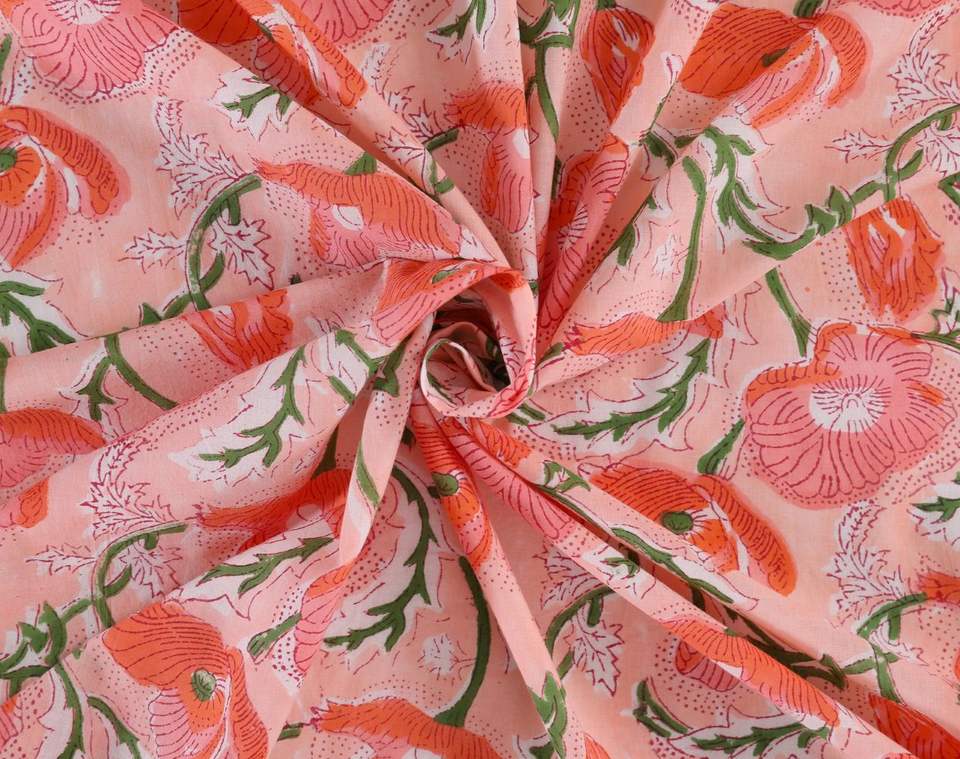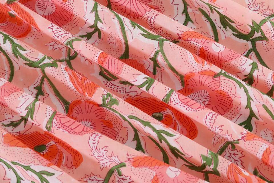 ผ้าพิมพ์ลายดอกป๊อปปี้ สีพีชชมพูเขียว พิมพ์ลายด้วยมือ ผ้าฝ้าย 100% เหมาะสำหรับทำชุดเดรส ผ้าม่าน ผ้าคลุมโซฟา ชุดเด็กผู้หญิง เนื้อผ้าเบา