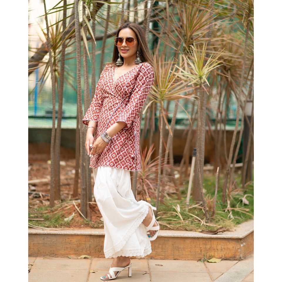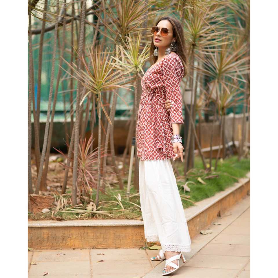 ชุดคุรตะผ้าฝ้ายสีแดงดอกป๊อปปี้สำหรับผู้หญิง ระบายอากาศได้ดี ไซส์ XS แขนสามส่วน สไตล์ลำลอง
