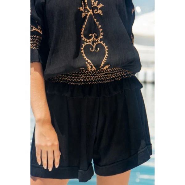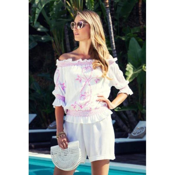 ชุดเสื้อและกางเกงขาสั้น2ชิ้นยอดนิยม,เสื้อเบลาส์ปักลาย Bardot แบบคลาสสิกแฟชั่นฤดูร้อนปี2022