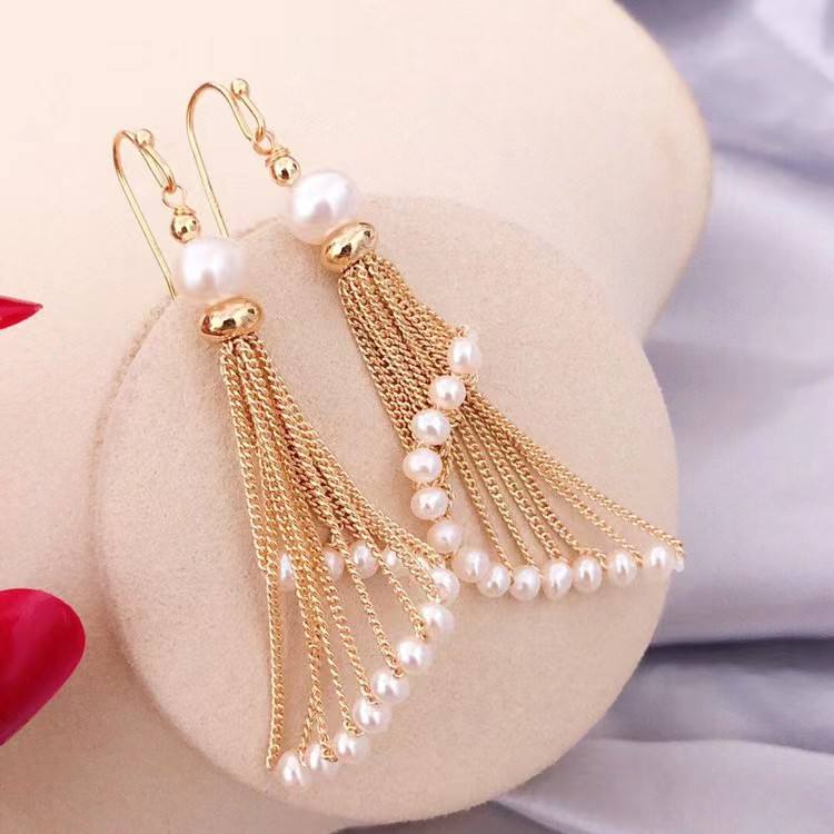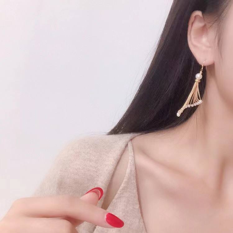 ต่างหูมุกน้ำจืด 5-6 เม็ด ยอดนิยม พร้อมพู่ห้อยยาว ตะขอเกี่ยวหู ชุบทอง 14K