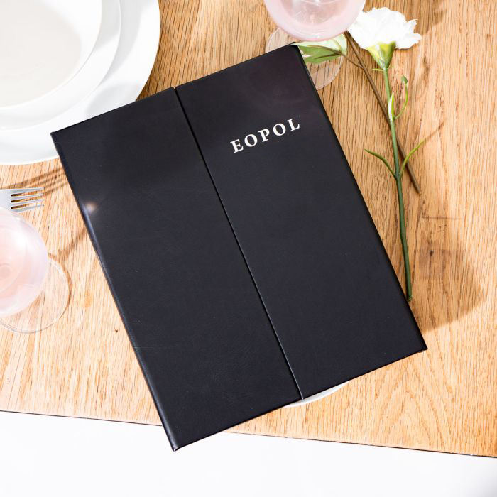 เมนูแบบพับเปิดได้ รุ่นยอดนิยม ปกหนัง PU สามหน้า พร้อมมุมยึดภายใน