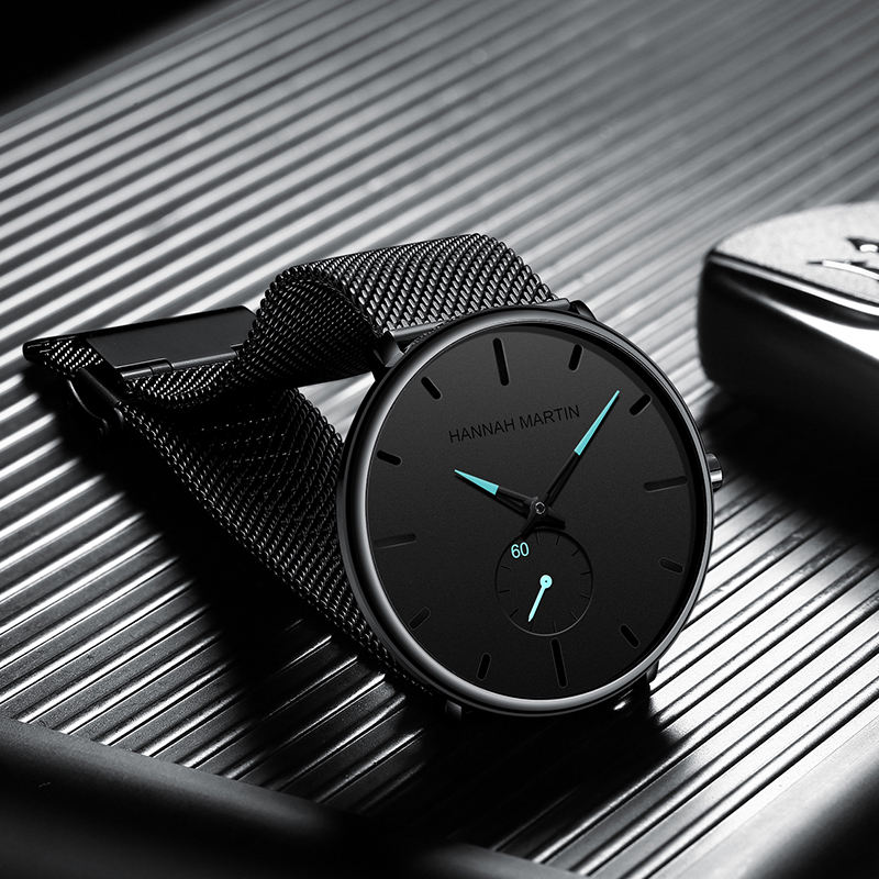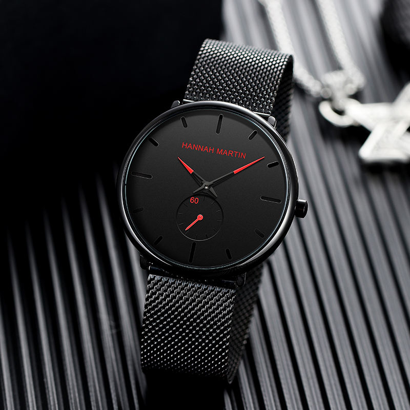 นาฬิกาควอตซ์ผู้ชาย ดีไซน์เรียบง่าย แฟชั่นธุรกิจ ยี่ห้อฮันนาห์ มาร์ติน รุ่นยอดนิยม สายสแตนเลสอัลลอยด์แบบตาข่าย กันน้ำ ขนาด 20 มม.