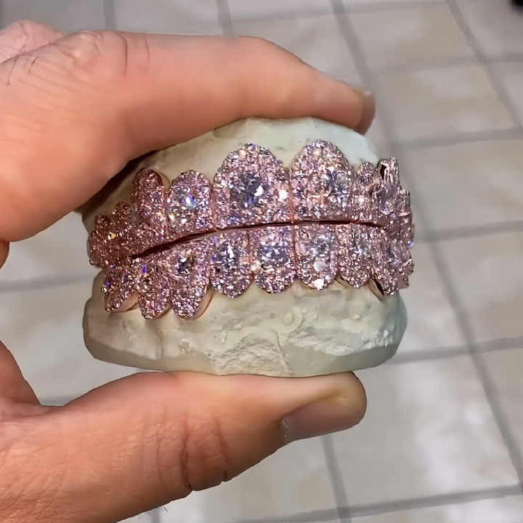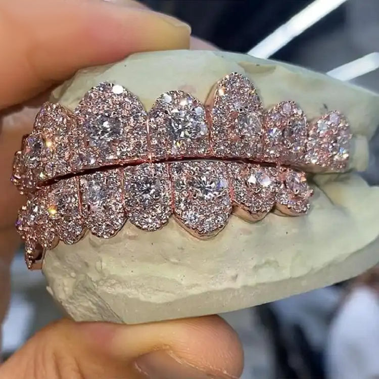 กริลล์ซฮิปฮอปยอดนิยมแบบสั่งทำพิเศษ ประดับมอสซาไนต์ไร้ตำหนิ หินใหญ่ VVS มอสซาไนต์กริลล์ซ 8 ฟันบน 8 ฟันล่าง แบบฝังเพชรเต็ม