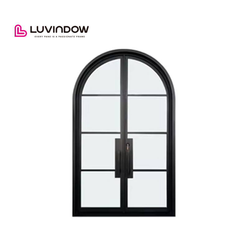ประตูทางเข้าหลักแบบคู่ประตูโค้งฝรั่งเศสประตูกระจกเหล็กภายนอก