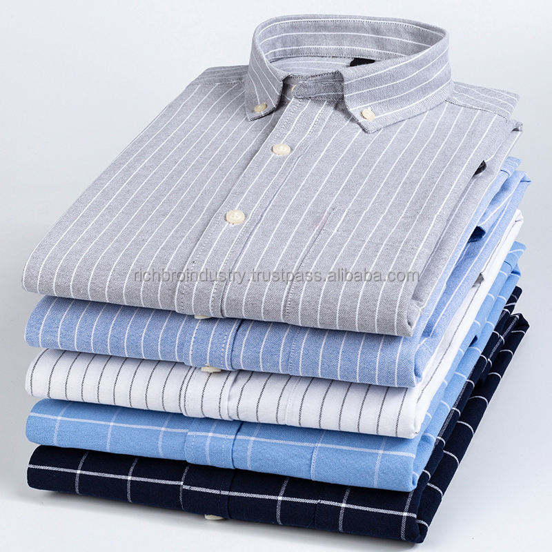 เสื้อเชิ้ตผู้ชายแขนยาวลายทางผ้าฝ้ายรักษ์โลกยอดนิยมสำหรับฤดูใบไม้ร่วง สีขาว ปกคอปกติดกระดุม ปลายแขนสี่เหลี่ยม ขายดี