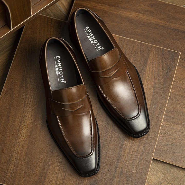 รองเท้าโลฟเฟอร์ทรงเหลี่ยมหนังแท้สำหรับผู้ชาย เพิ่มความสูง รองเท้าแต่งงาน รองเท้าหนังสั่งทำพิเศษ