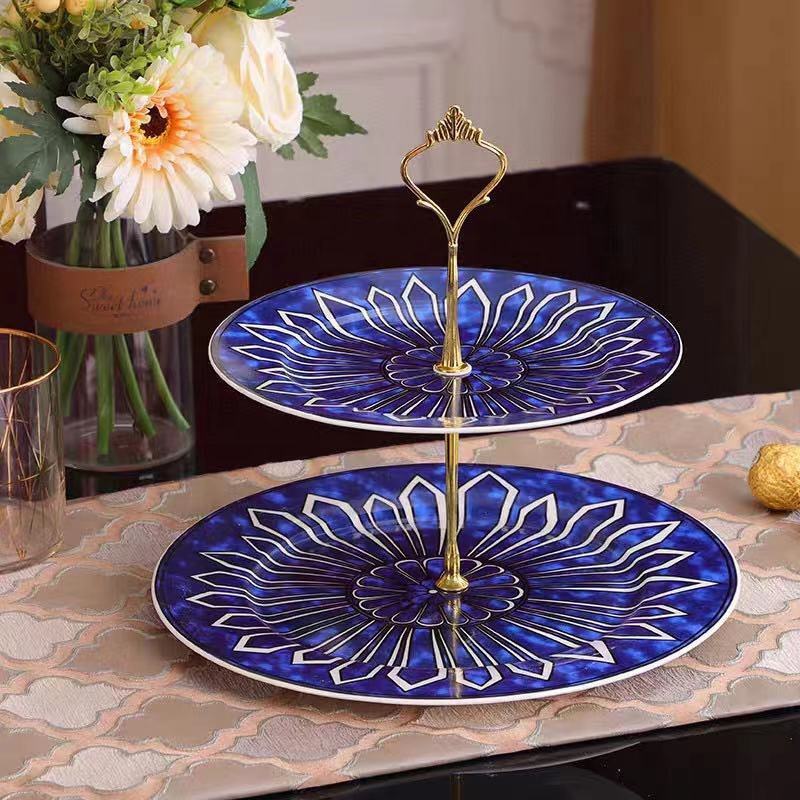 จานโลหะสีทอง2ชั้นพอร์ซเลนสำหรับเค้กแต่งงานจานผลไม้