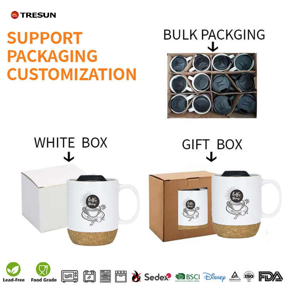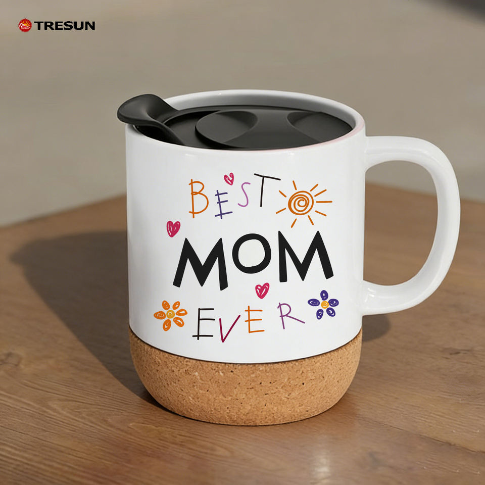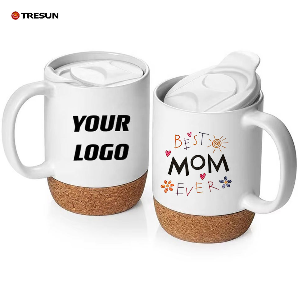 แก้วเซรามิกพอร์ซเลนฐานไม้ก๊อก 15 ออนซ์ 11 ออนซ์ แก้วมัคพิมพ์โลโก้ ของขวัญวันแม่ ชุดแก้วกาแฟสีขาวพร้อมฐานและฝาไม้ก๊อก