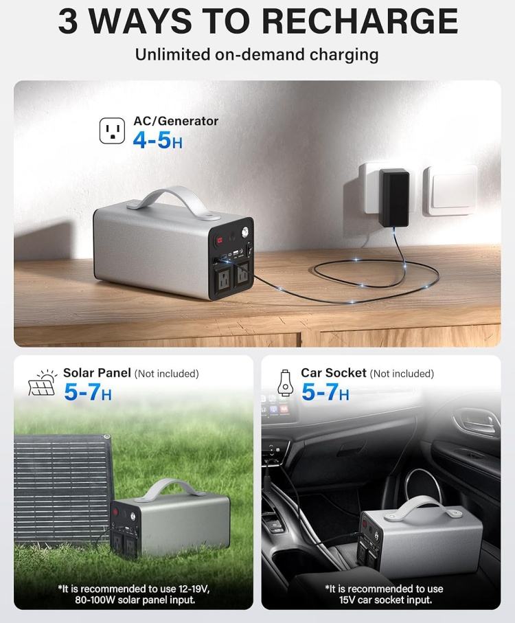 Recharge options:AC + Car + Solar Charging