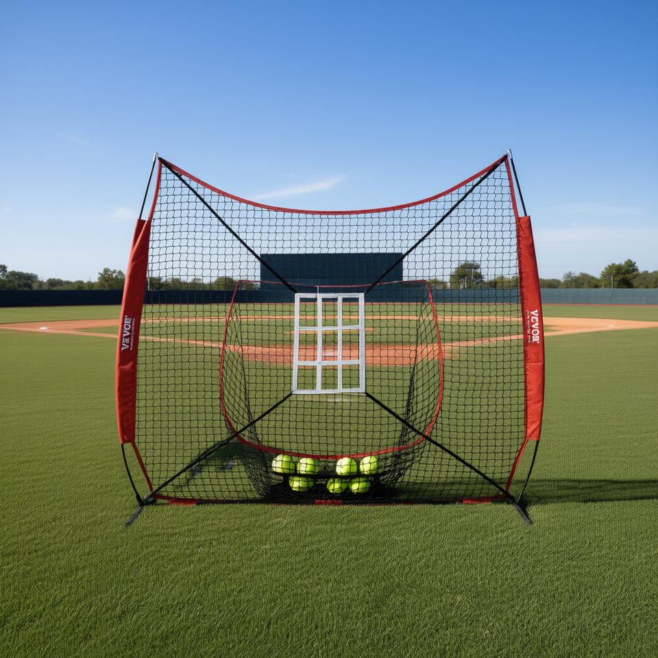 ตาข่ายฝึกซ้อมเบสบอลซอฟต์บอลแบบพกพาขนาด 7x7 ฟุต พร้อมเป้าหมายโซนตี 12 ลูก ที่เก็บลูกแบบ Tee Ball สีแดง อุปกรณ์ฝึกซ้อม