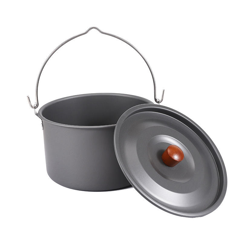 หม้ออลูมิเนียมอัลลอยด์แบบพกพาขนาด 5.5 ลิตรพร้อมด้ามจับไม้สำหรับทำอาหารกลางแจ้งและกองไฟ เหมาะสำหรับ 4-6 คน