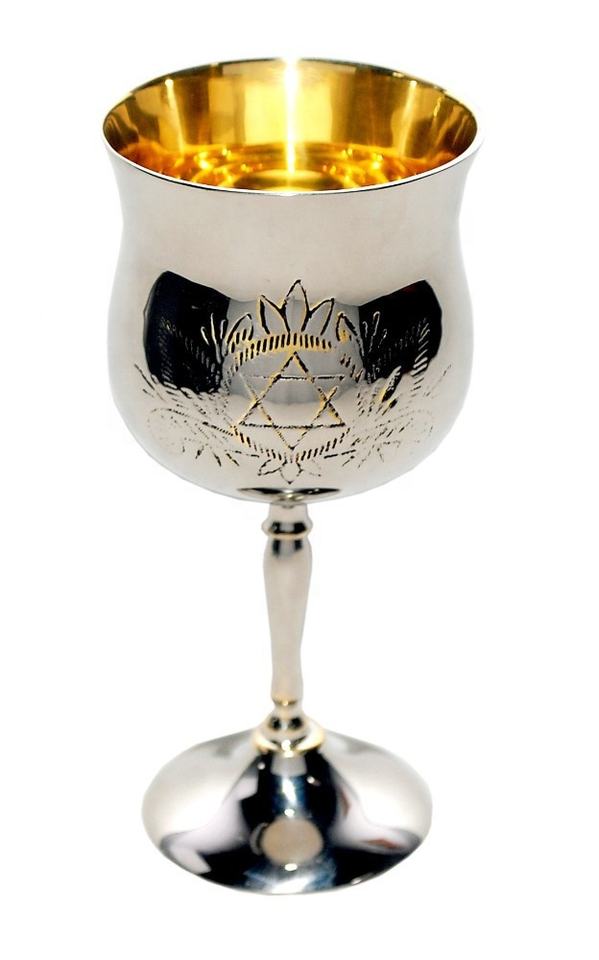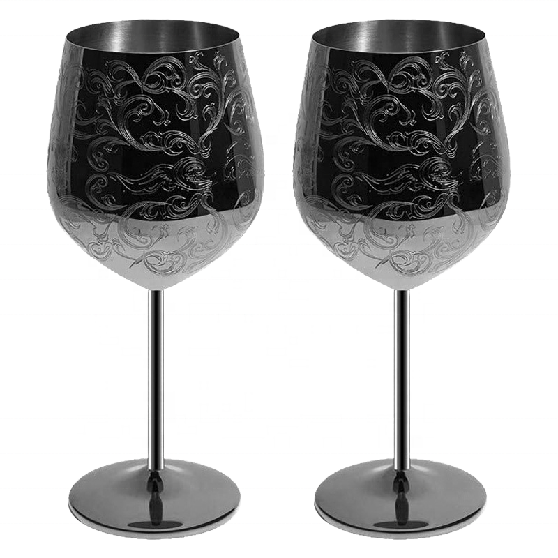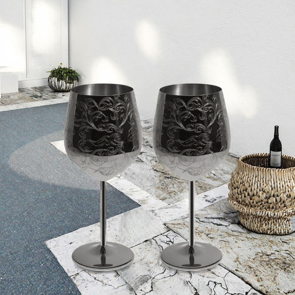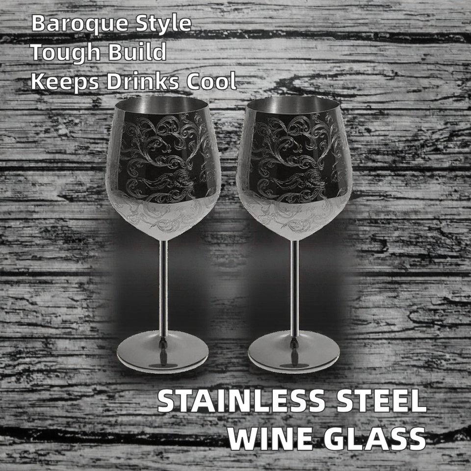 แก้วไวน์สแตนเลสสตีลลายแกะสลักสไตล์บาโรกแบบพกพา แก้วทรงสูงสีเงินสุดหรูสำหรับดื่มไวน์